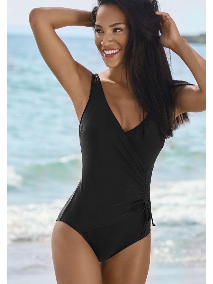 Купальник от Lascana в модном дизайне с запахом. Боковые сборки на шнурках. Резинка под грудью спереди. Широкие регулируемые лямки. Эластичный материал с переработанным полиамидом.