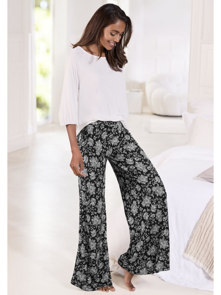Мягкая струящаяся пижама от Vivance Dreams. Рубашка с широким круглым вырезом и рукавами средней длины с эластичным подолом. Брюки свободного кроя с узором «пейсли» и эластичным поясом. Удобная посадка. Джерси из вискозы.
