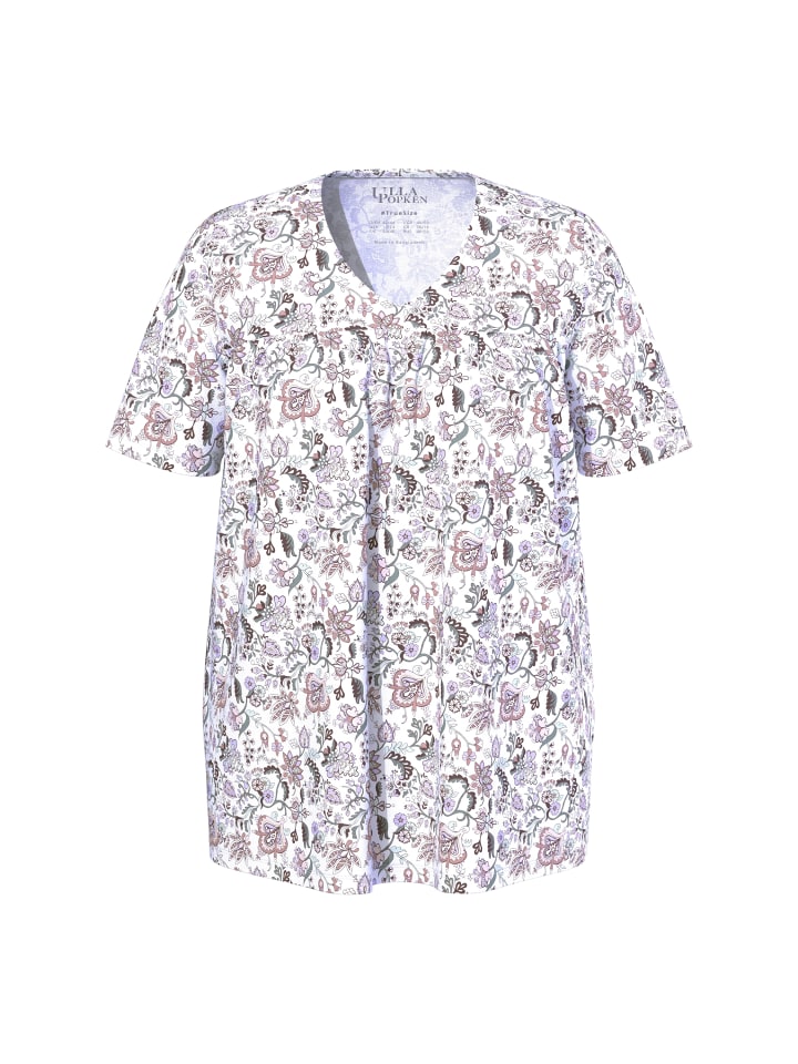 Пижама, раздельная. Топ с цветочным принтом, V-образным вырезом и оборчатым горизонтальным швом. Рукав до середины. Длинные прямые брюки с эластичным поясом и завязкой. Боковые карманы и короткие боковые разрезы по подолу. Материалы