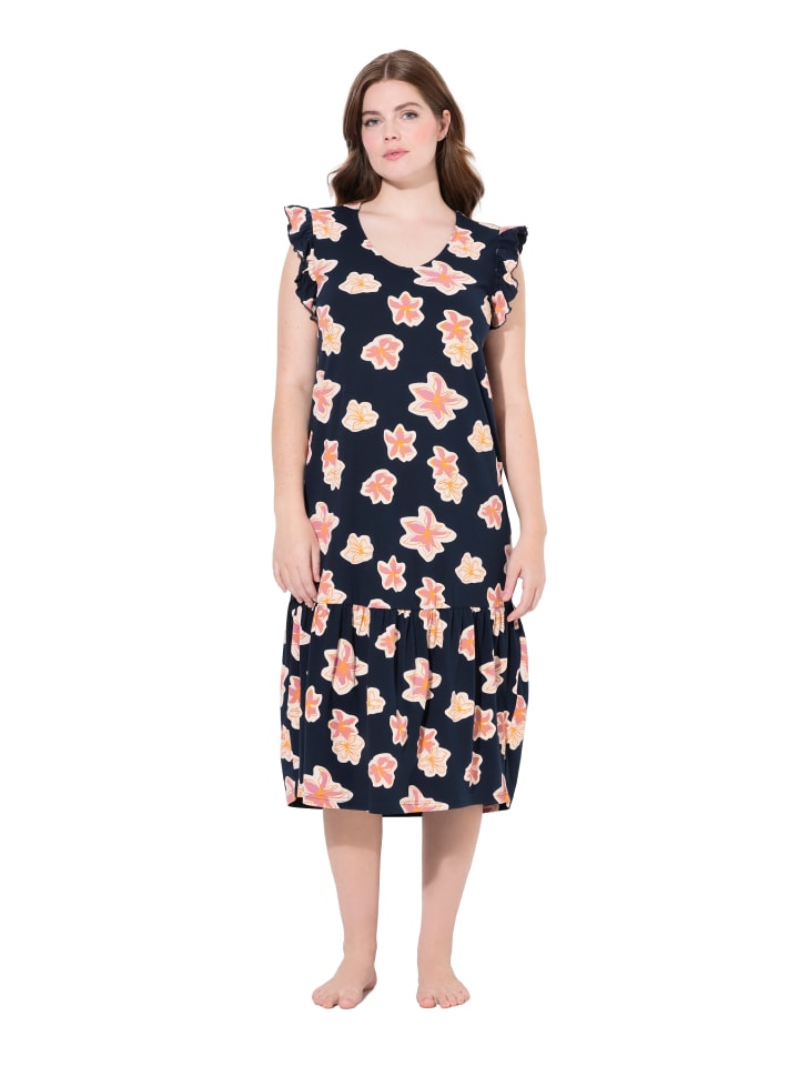 Ночная рубашка из органического хлопка. Удобный удлиненный фасон из мягкого трикотажа с цветочным принтом по всей поверхности. Округлый V-образный вырез, короткие рукава-крылышки, оборка по подолу. Органический; сертифицирован ECOCERT Greenlife Лицензия №. 152026. Материалы