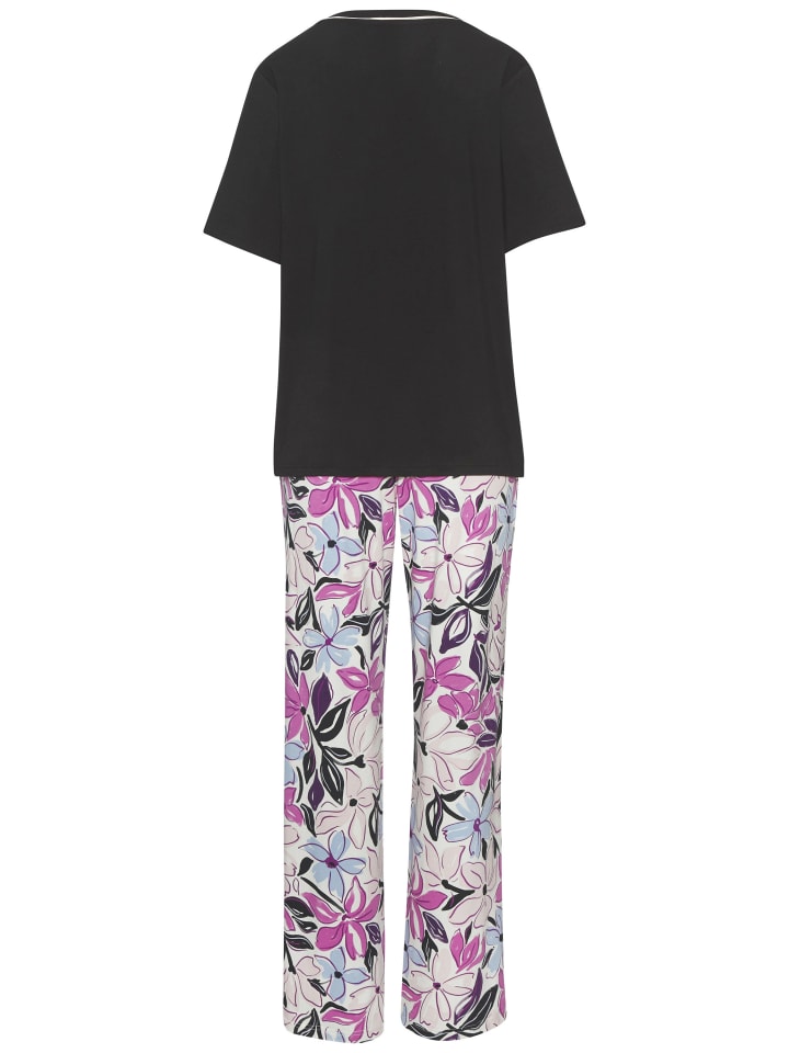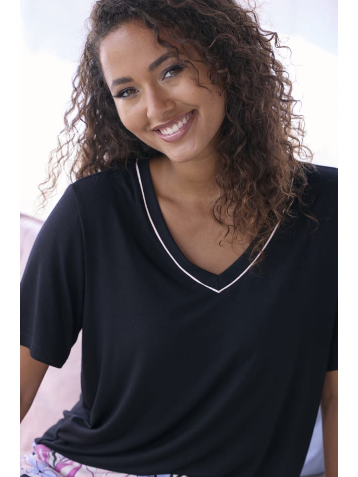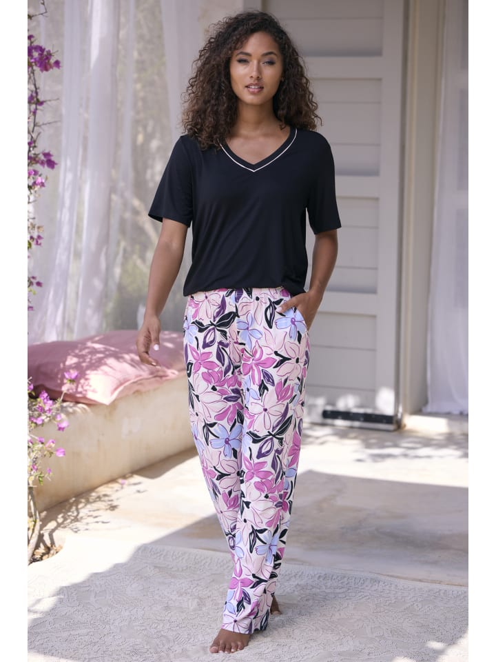 Пижама от Lascana. Однотонная футболка с блестящей контрастной окантовкой на V-образном вырезе и коротких рукавах. Брюки с цветочным принтом и эластичным поясом на шнурке. Мягкая смесь вискозы.