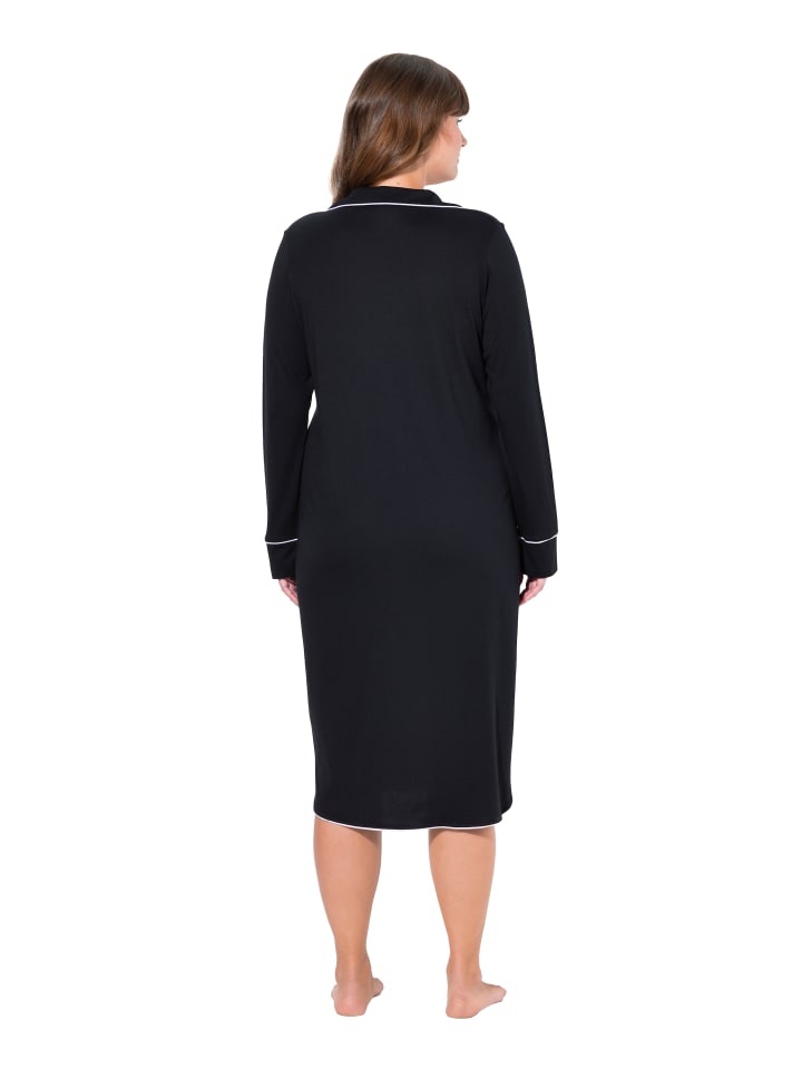 Ночная рубашка в пижамном стиле с декоративной окантовкой. V-образный вырез с воротником-лацканами, длинные рукава. Слегка закругленный подол с разрезами по бокам для еще большего комфорта. Материалы