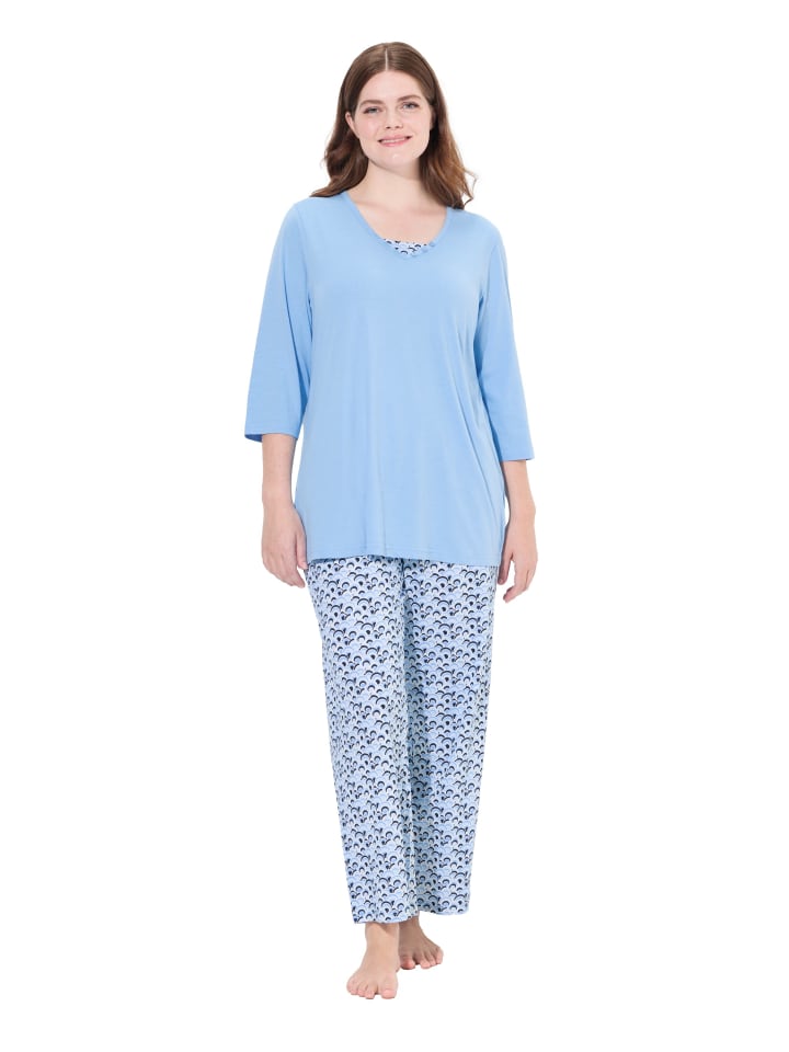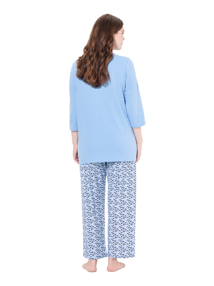Пижама, раздельная. Однотонная рубашка с V-образным вырезом, рукава 3/4. Длинные прямые брюки с принтом по всей поверхности. Эластичный пояс, боковые карманы. Материалы