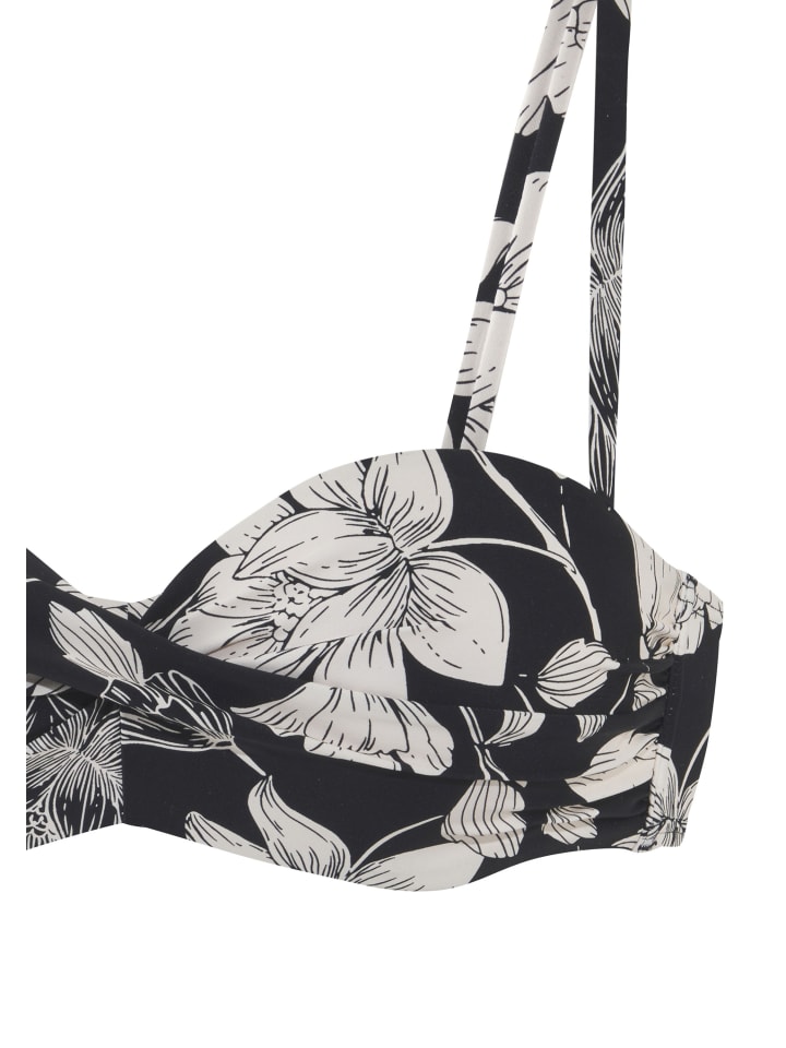 Бюстгальтер-бандо на косточках от s.Oliver. Цветочный принт по всей поверхности. Собранный фронт. Съемные подушечки для чашек А и В. Съемные бретели. Концепция микс-кини. Удобное качество с долей переработанного полиамида.