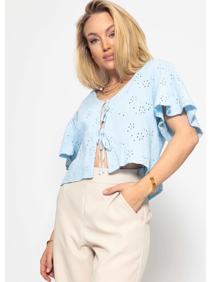 Эта воздушная муслиновая блузка сочетает в себе женственную элегантность с нотками стиля бохо. Тонкая вышивка с отверстиями придает дизайну нежный, игривый вид и придает дополнительный легкий вид. Глубокий V-образный вырез дополняется декоративными завязками, которые не только создают романтический акцент, но и позволяют индивидуализировать посадку. Широкие короткие рукава обеспечивают удобство ношения и подчеркивают повседневно-элегантный вид. Будь то джинсы, льняные брюки или струящаяся юбка, эта блузка универсальна в сочетании и придаст стильную легкость любому наряду.
