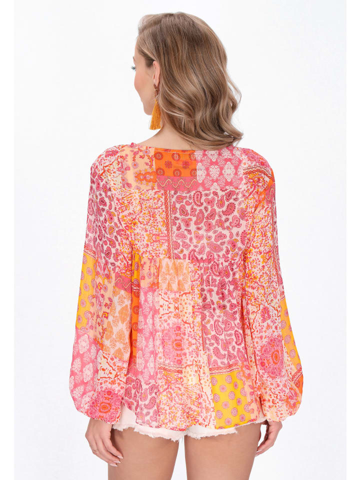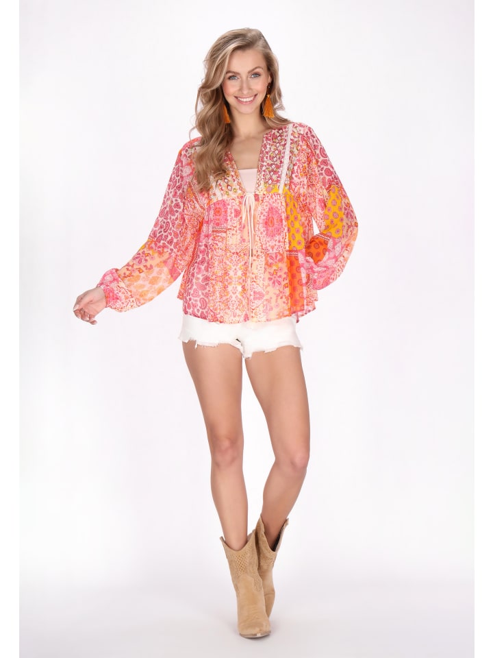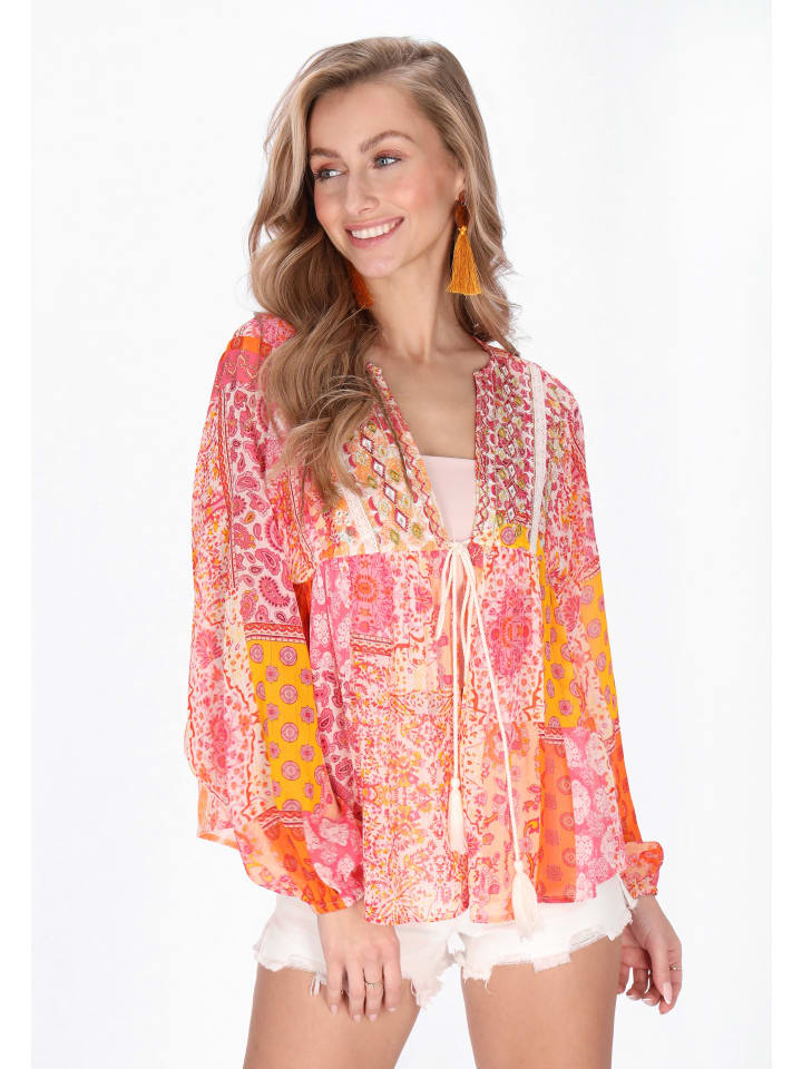 Elevate your style with this stylish blouse from our Boho Collection. Featuring a relaxed fit and V-neckline, it offers effortless charm. Long sleeves with elastic cuffs add elegance, while the lace tape and embroidery details enhance its appeal. Crafted from chiffon with bandana print and metallic thread accents, it's perfect for festival fashion lovers.