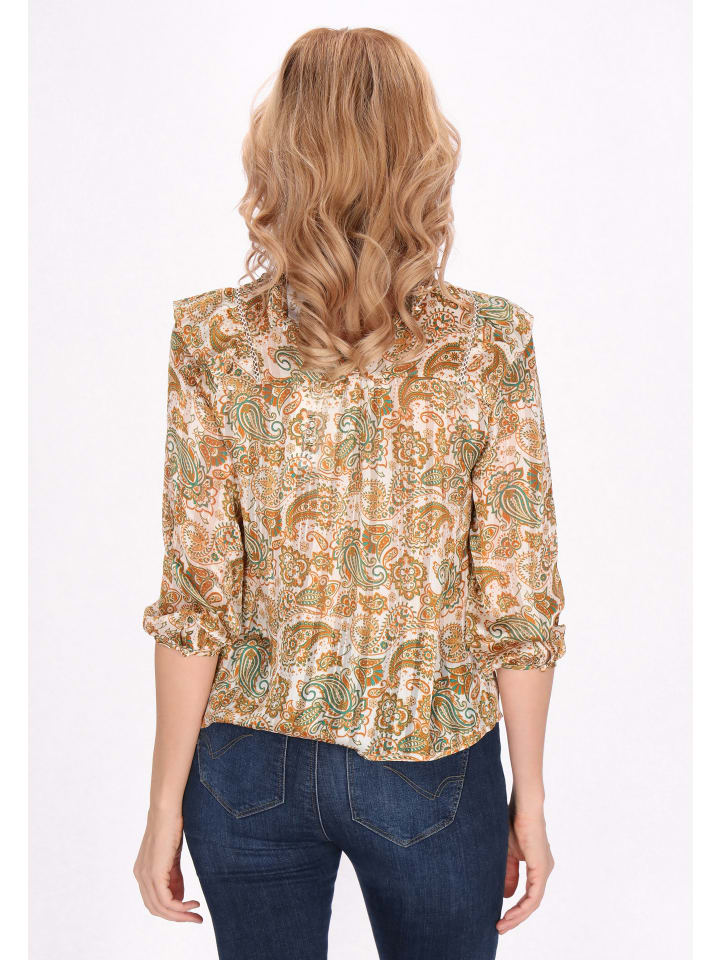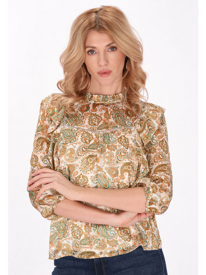 Enhance your style with this regular-fit blouse. The stand-up collar and 3/4 sleeves create an elegant silhouette, while the embroidered ribbon and metallic thread add a chic touch. Made of lightweight chiffon, it showcases a beautiful paisley print, making it a stylish addition to any fashionista's closet. This blouse is part of the Fashion Look Collection.
