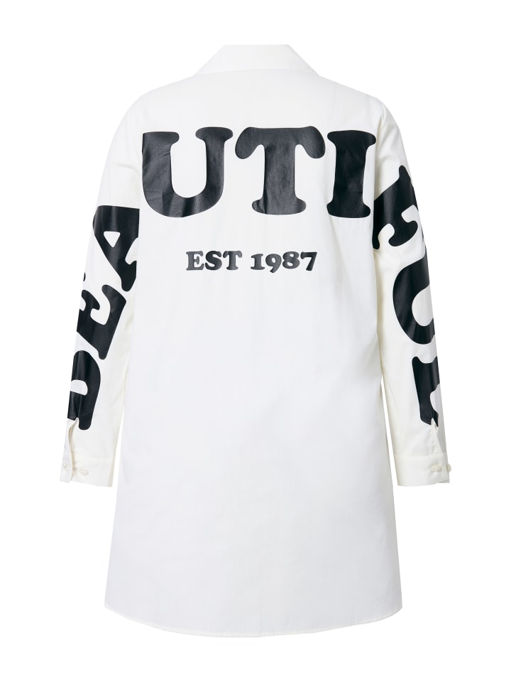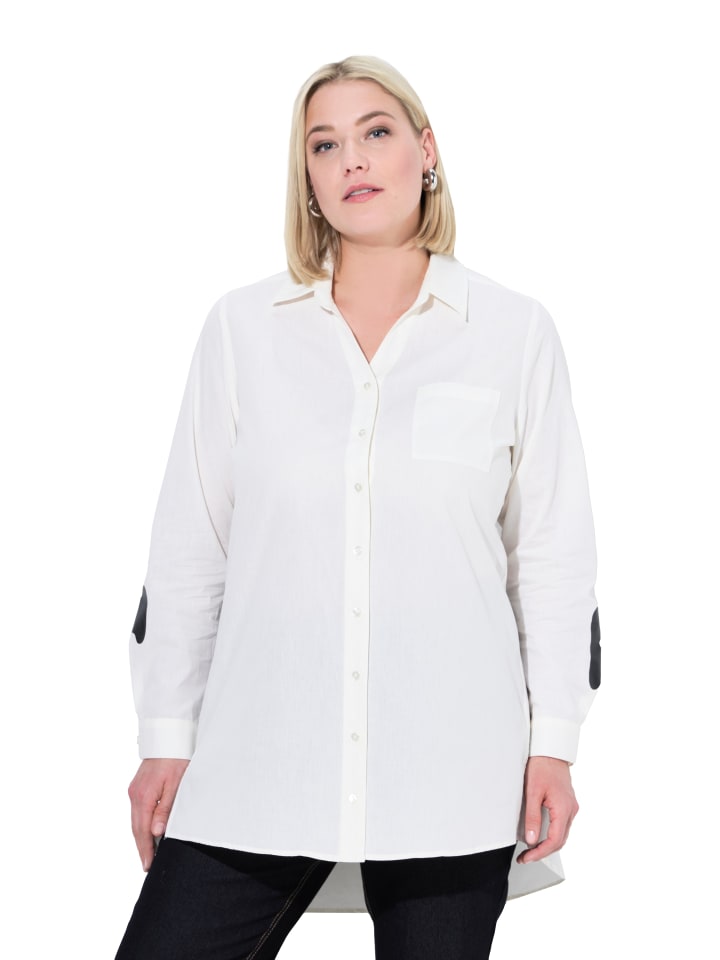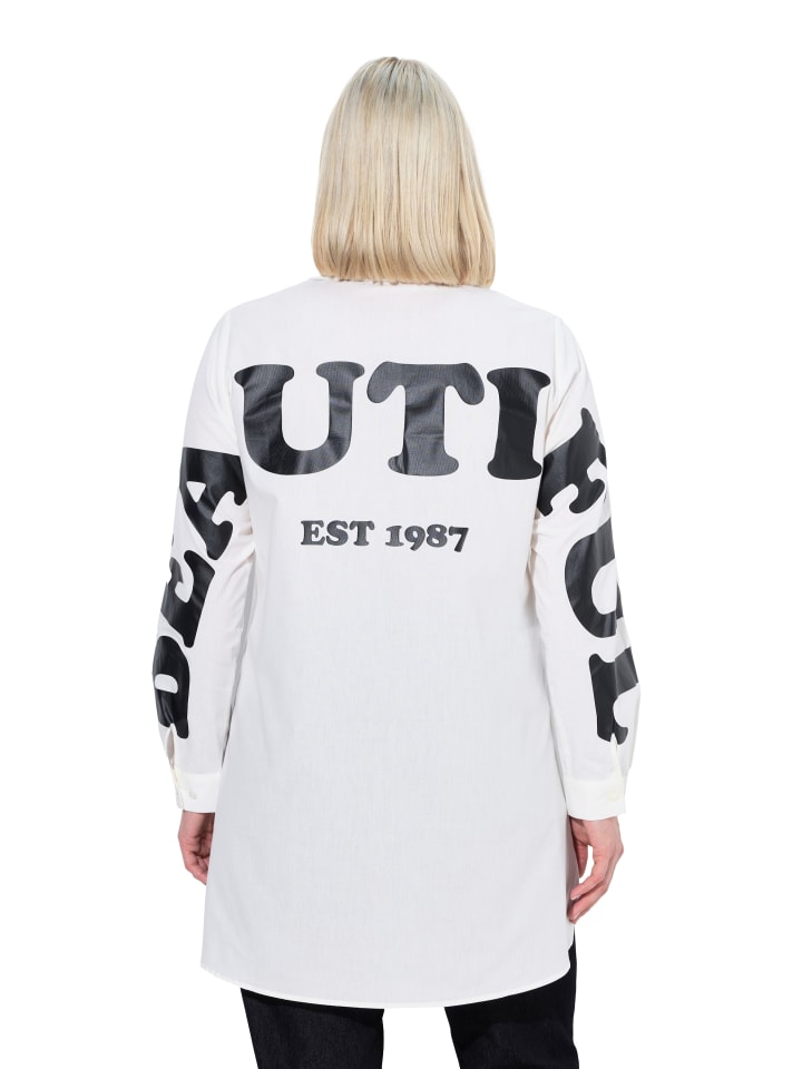 Длинная блузка, длинная удобная посадка, с надписью XL на спине и нагрудным карманом. Воротник рубашки, сплошная планка на пуговицах, нагрудный карман. Длинный рукав с манжетами, слегка скрученные боковые швы с закругленными разрезами на подоле - еще больше комфорта при ношении.материал