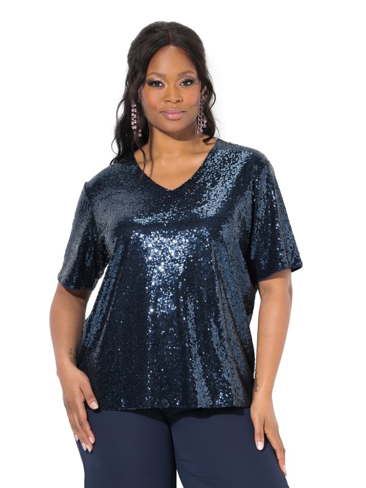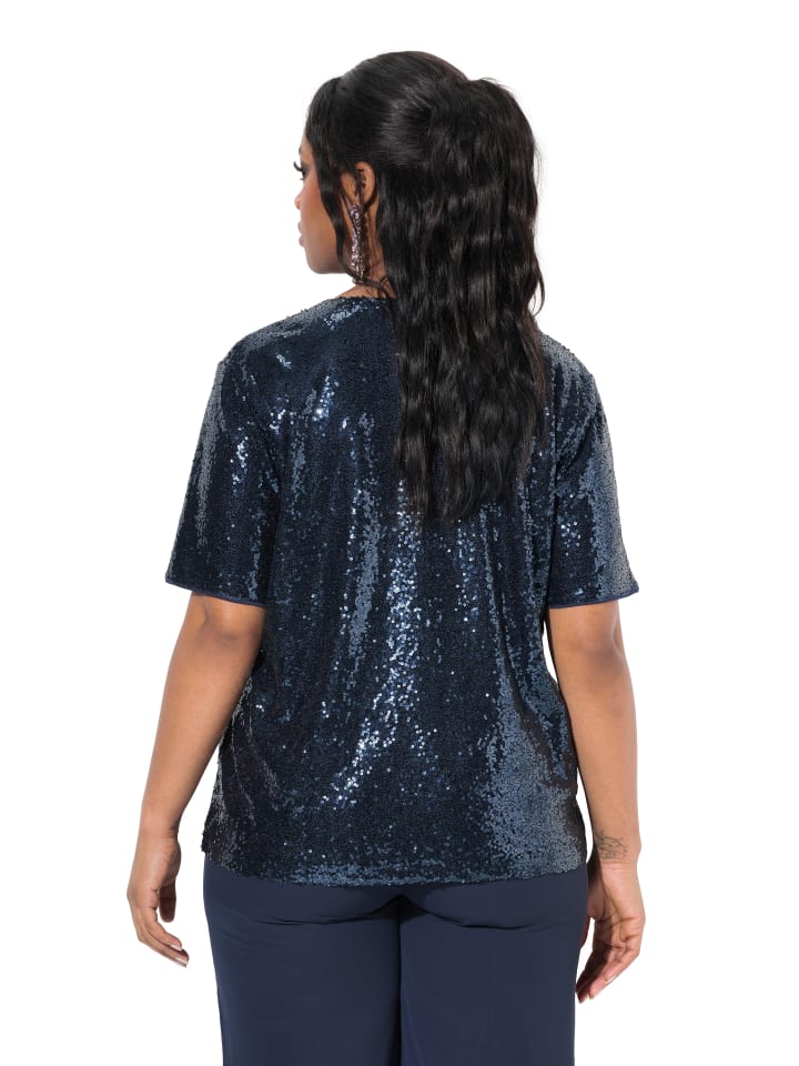 Блузка-рубашка свободного кроя с пайетками по всему телу. Закругленный V-образный вырез, полурукавка. Под ним гладкая трикотажная рубашка.материалы