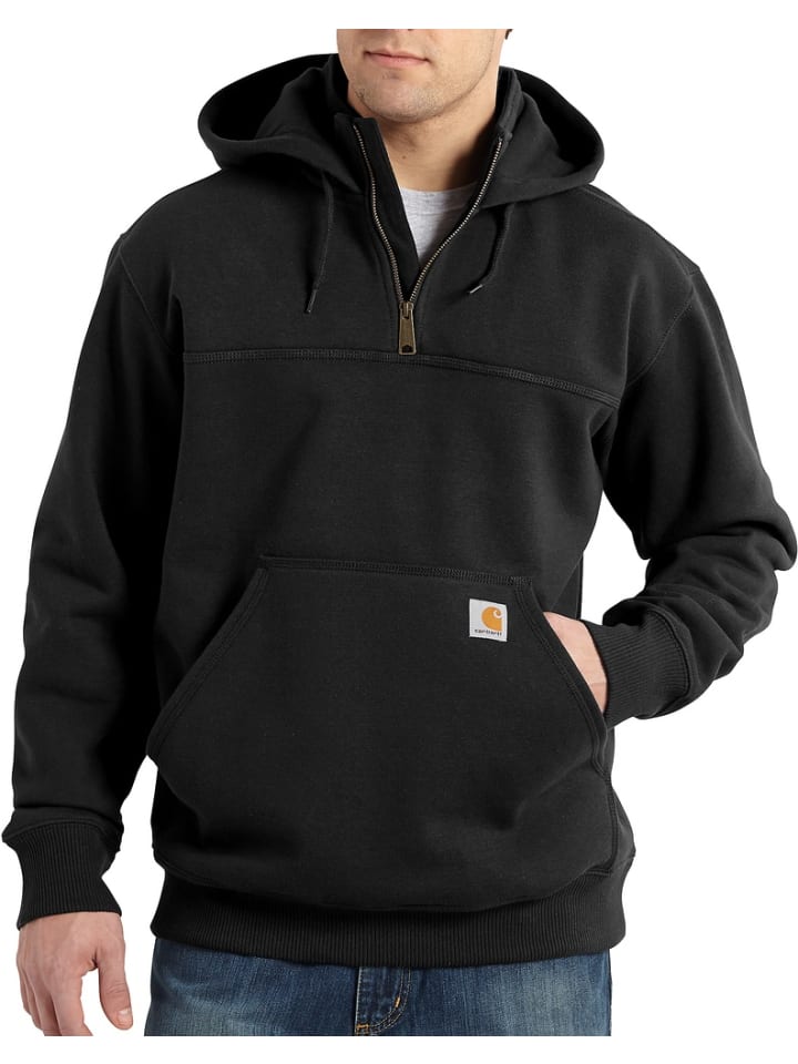 Водоотталкивающая толстовка с капюшоном. Свободный крой · 13 унций/ярд² - 441 г/м² · 55% хлопок/45% полиэстер · Флис DWR · Rain Defender - прочная водоотталкивающая отделка · Трехсекционный капюшон с регулируемым шнурком · Два нижних кармана для рук спереди · Молния до середины длины спереди · Эластичные, усиленные эластаном манжеты и пояс в рубчик · На кармане пришита этикетка Carhartt. Материал: