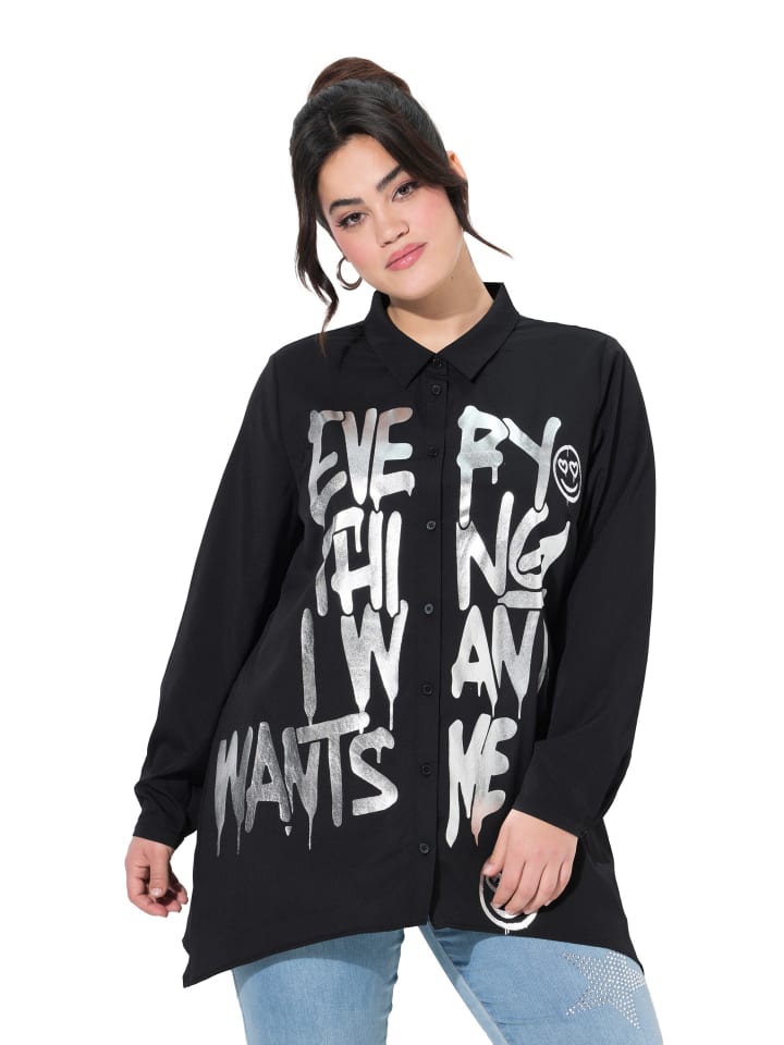 Блузка А-силуэта с крупными металлическими надписями и отделкой на конце. Воротник рубашки с длинным рукавом и манжетами.материал