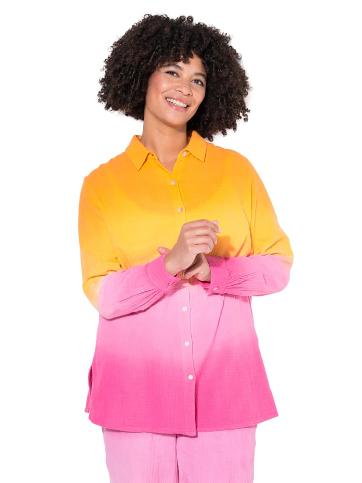 Муслиновая блузка большого размера, с мягким градиентом. Воротник рубашки, широкие плечи, длинные рукава с манжетами.материал