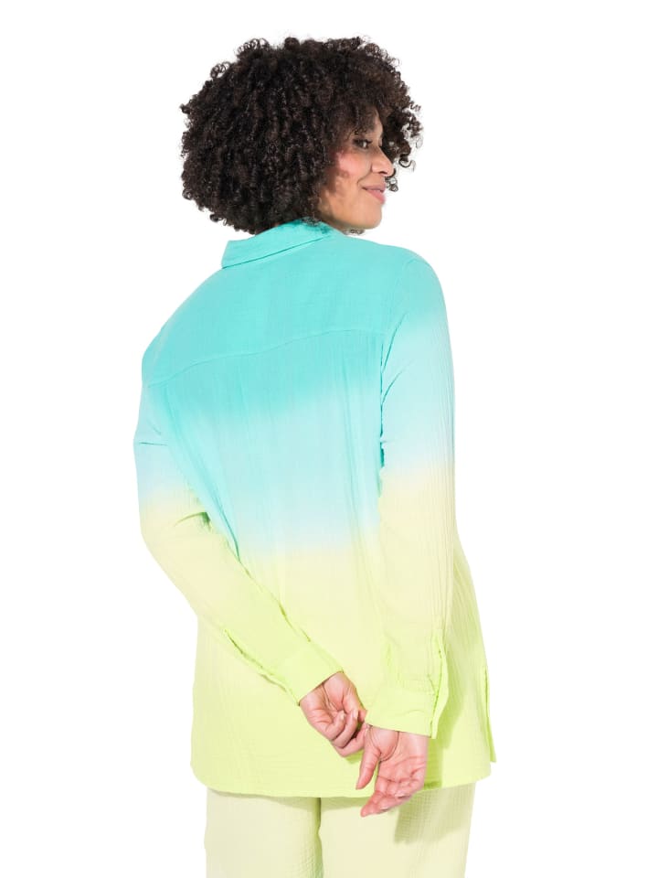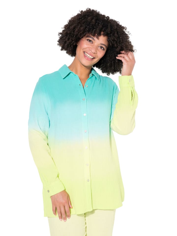 Муслиновая блузка большого размера, с мягким градиентом. Воротник рубашки, широкие плечи, длинные рукава с манжетами.материал