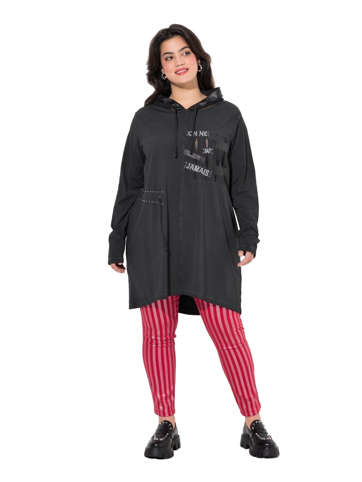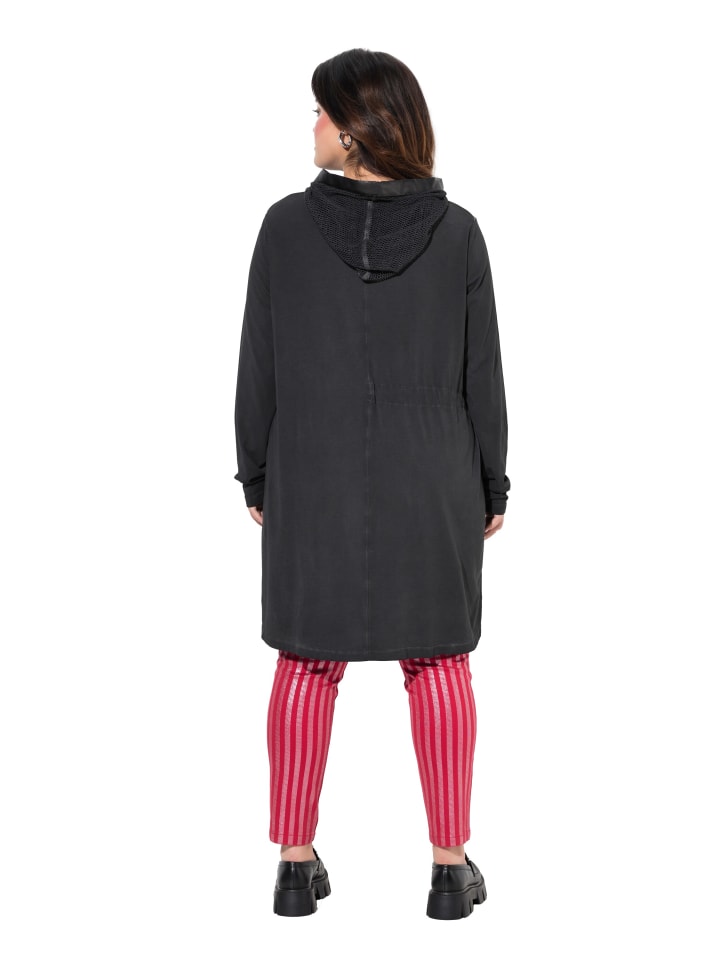 Длинная толстовка, удлиненный свободный крой, с сетчатым капюшоном и блестящими камнями. Современное сочетание материалов с сеткой и оборками. Спущенные плечи, длинные рукава. Подол сзади удлинен. Материалы