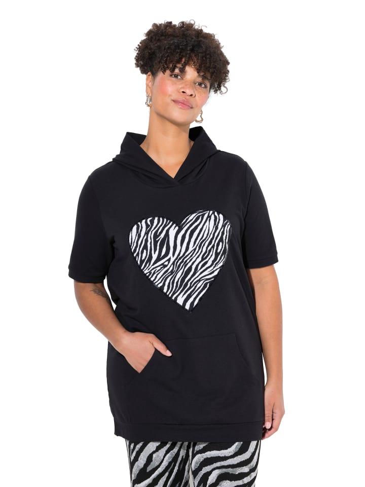 Свободная толстовка с капюшоном из очень мягкого трикотажа с декором в виде леопардового сердца и карманом-кенгуру. Короткие рукава, ребристые манжеты. Материалы