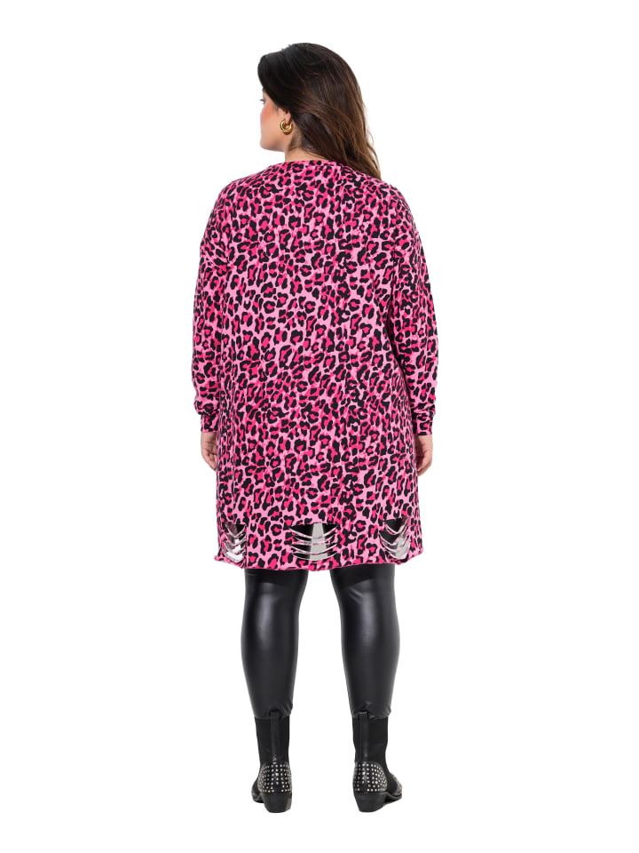 Свитшот свободного кроя из мягкого трикотажа с леопардовым принтом и металлическим черепом. Очень модно: рваный подол, удлиненная спинка. Круглый вырез, спущенная линия плеча, длинные рукава. Материалы: 100% хлопок.