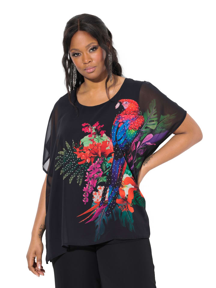 Блузка-рубашка, удобная посадка, двухслойная. Прозрачный шифон с блестящими камнями на мотив попугая. V-образный вырез, плечи внахлест, полурукавки. Под ним непрозрачный трикотаж.материалы