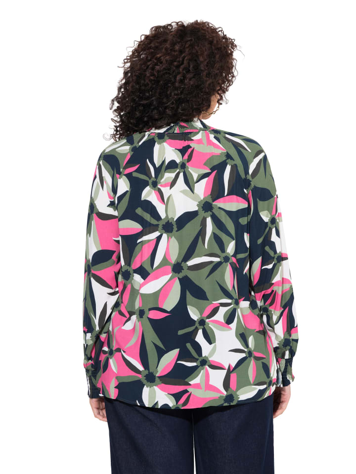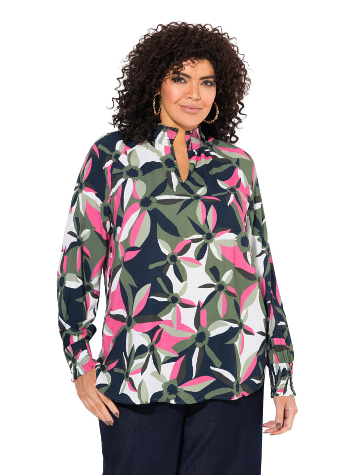 Туника классической формы из мягкой вискозы с абстрактным цветочным узором. Изюминка: эластичный мокрый воротник с разрезом, реглан с длинным рукавом и эластичной мокрой отделкой. Боковые прорези для гладкого корпуса.материал