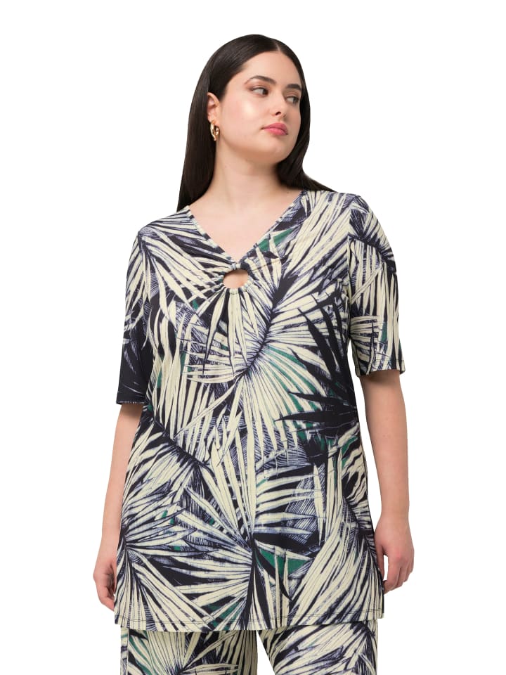 Футболка А-силуэта с принтом пальм. V-образный вырез с декоративным кольцом, короткие рукава. Боковые разрезы для удобной посадки. Материалы