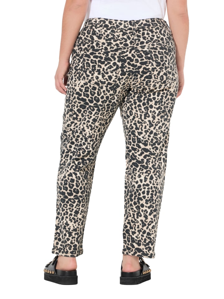 Джинсы-бойфренды свободного кроя из мягкого денима с леопардовым принтом и эластичной отделкой. Отворот по низу, 5 карманов. Пояс, начиная с размера 50, эластичный, со шлевками, пуговицей и молнией. Материалы: Внешний материал: 98% хлопок, 2% эластан