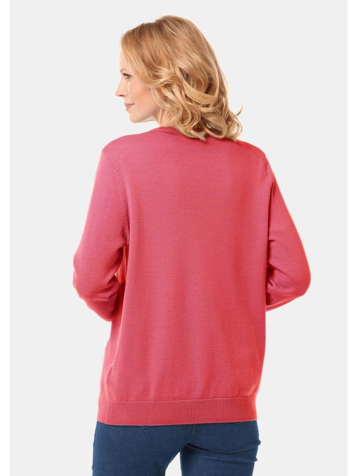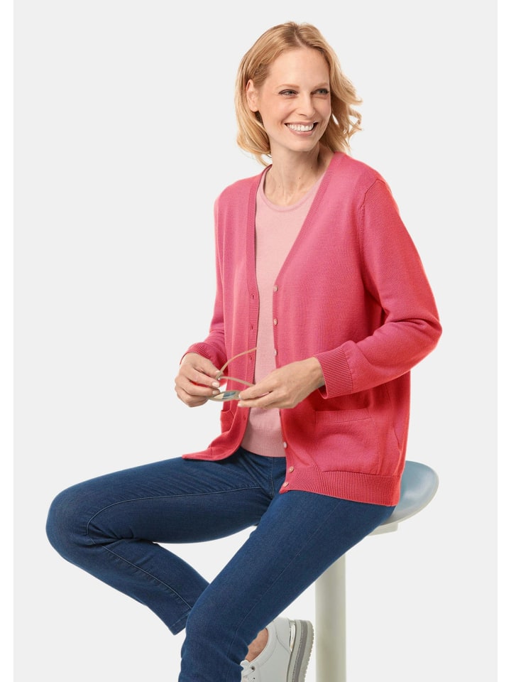 Кардиган из чистой шерсти мериноса - восхитительно мягкий и приятный на коже, потому что высокое качество обеспечивает температурную балансировку. Классическая форма кардигана с V-образным вырезом и узкой полоской на пуговицах. Длинные рукава с манжетами в рубчик и подолом в рубчик. Накладные карманы дополняют модель. Кардиган для быстрого надевания или в качестве элегантного партнера в паре твинсет! Длина около 67 см в гр. 46, около 63 см в гр. 23.