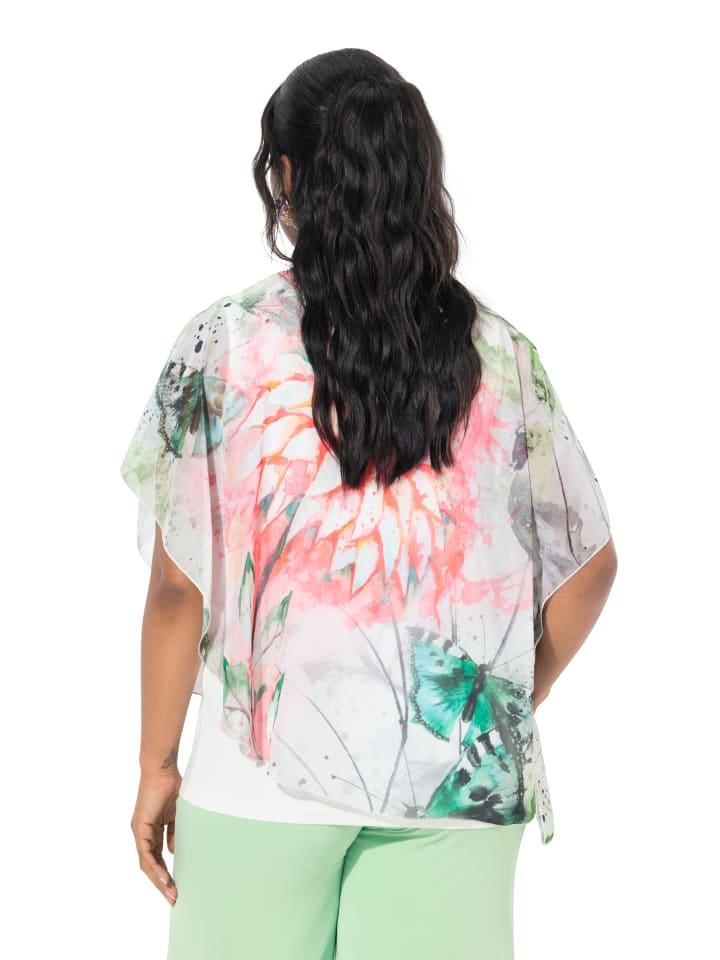 Блузка, удобная посадка, двухслойная. Прозрачный шифон с блестящими камнями на цветочном принте. Круглый вырез, плечи внахлест, полурукавки. Под ним непрозрачный трикотаж.материалы