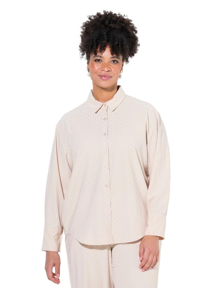 Блузка большого размера из мягкой ткани с блестящими камнями. Воротник рубашки, планка на пуговицах, длинный рукав с манжетами. Закругленный подол, сзади длиннее.материал