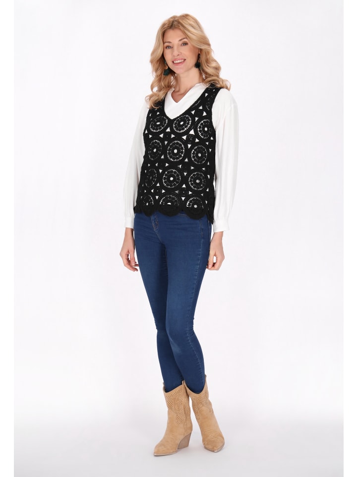 Enhance your fashionable look with this stylish regular cut vest. The fashionable V-neckline and sleeveless style provide comfort on warm days. Made of knit fabric, it features an eye-catching ajour pattern and decorative hems for added appeal. Perfect for layering or wearing solo. It is a must-have item for your closet. It is part of our Fashion Look Collection.