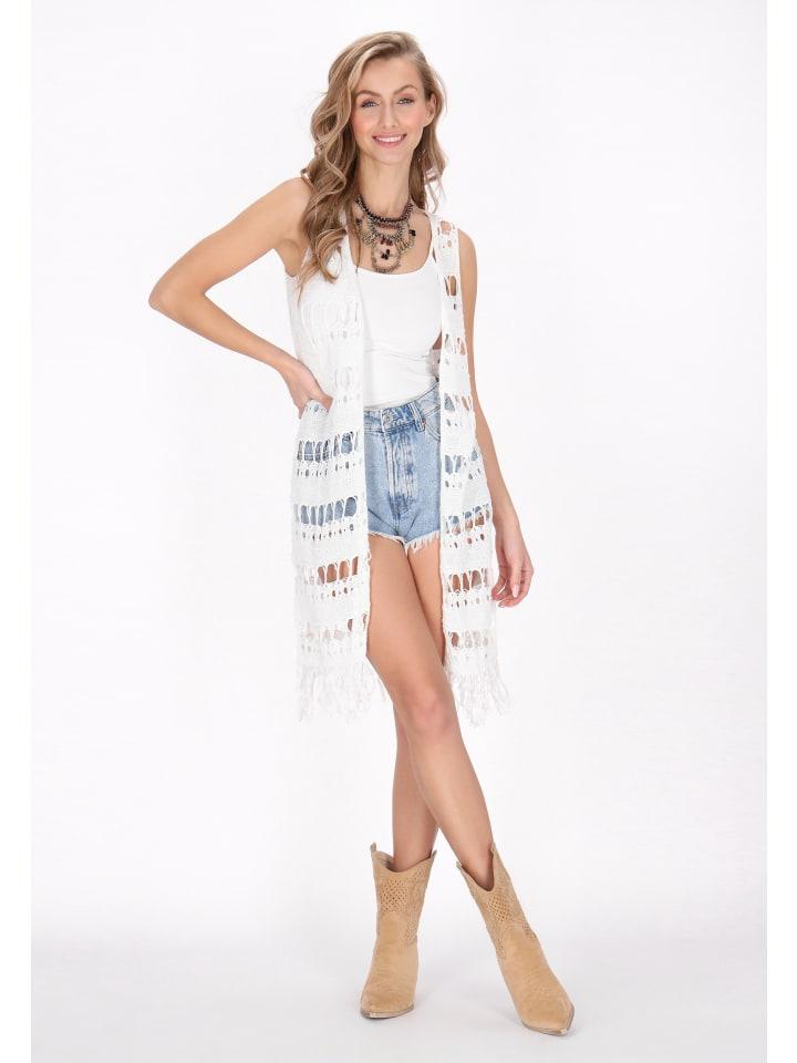 Elevate your closet with this ethno-inspired sleeveless vest. With intricate openwork patterns and fun tassels, this stylish piece will add a boho touch to any outfit. The open front design and lightweight knit fabric make it ideal for layering over tops or dresses. Suitable for fashion lovers who appreciate festival pieces. It is from our Boho Collection.