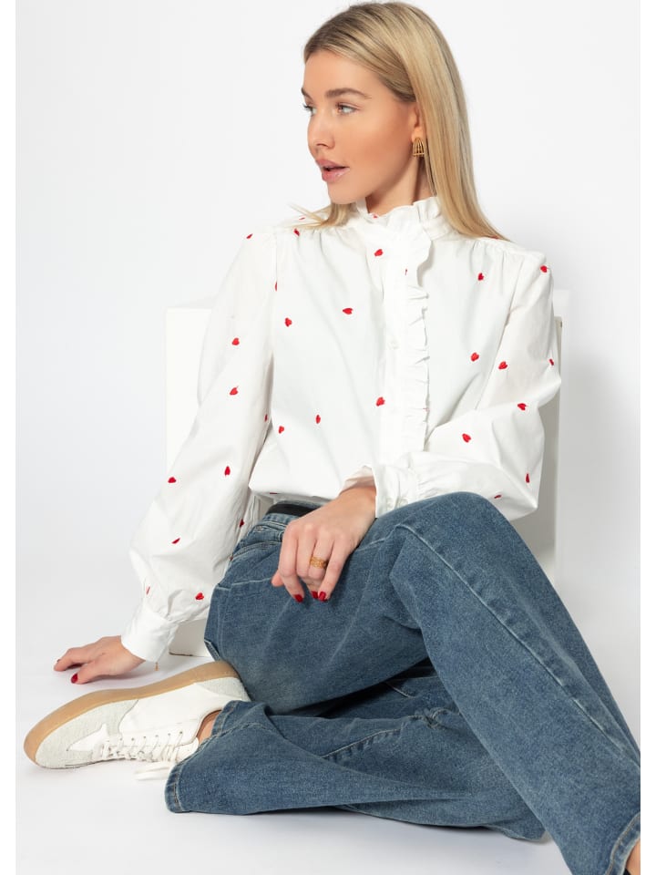 - ДИЗАЙН: Стильная белая блузка с красной вышивкой в форме сердца и женственными воланами на пуговицах – игривый и элегантный образ.