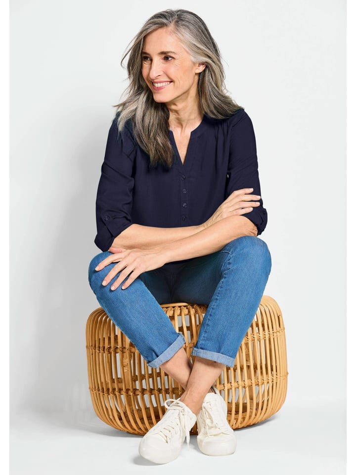 Блузка из чистого вискозы - приятная мягкая для максимального комфорта! Базовая модель отличается удобным расширением благодаря складкам на плечах и посадке сзади. Сзади она немного длиннее, а закругленный подол и боковые разрезы придают ей непринужденный вид. Круглый вырез с лицевой панелью переходит в удлиненный V-образный вырез с маленькой планкой на пуговицах. Блузка с длинными рукавами и манжетами станет отличным дополнением вашего наряда в любое время года! Длина около 73 см в Gr. 46, около 69 см в Gr. 23.