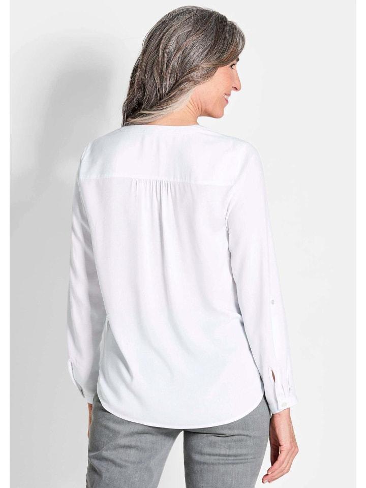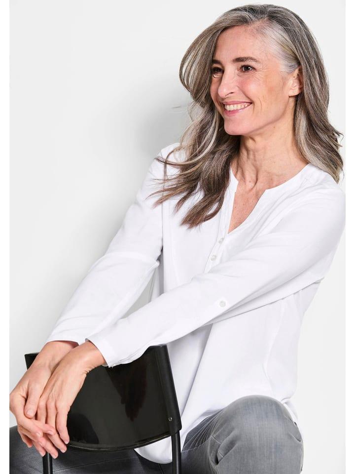 Блузка из чистого вискозы - приятная мягкая для максимального комфорта! Базовая модель отличается удобным расширением благодаря складкам на плечах и посадке сзади. Сзади она немного длиннее, а закругленный подол и боковые разрезы придают ей непринужденный вид. Круглый вырез с лицевой панелью переходит в удлиненный V-образный вырез с маленькой планкой на пуговицах. Блузка с длинными рукавами и манжетами станет отличным дополнением вашего наряда в любое время года! Длина около 73 см в Gr. 46, около 69 см в Gr. 23.