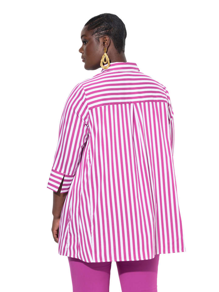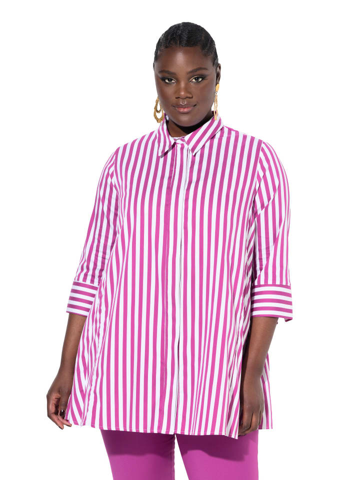 Блузка в полоску, А-силуэтом, со складками по бокам и широким развевающимся подолом. Воротник рубашки, потайная планка на пуговицах, боковые карманы на швах. 3/4 рукава с манжетами.материал