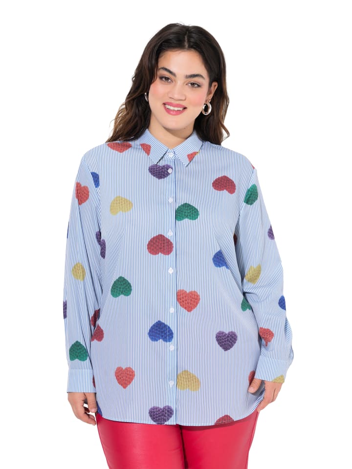 Блузка свободного кроя, с сердечками в полоску. Воротник рубашки, плечи внахлест, длинные рукава с манжетами.материал