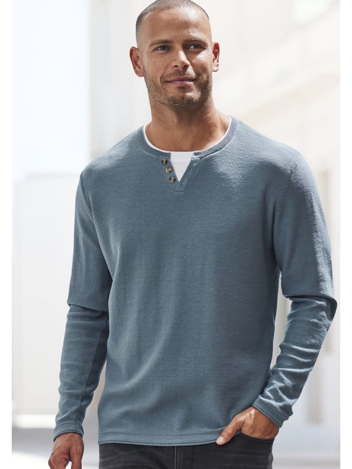 Повседневный свитер тонкой вязки от HIS с пуговицами и стильным двухслойным дизайном на круглой горловине. Корпус и рукава заканчиваются небольшим закругленным краем. Отлично подходит для досуга. Удобное качество.