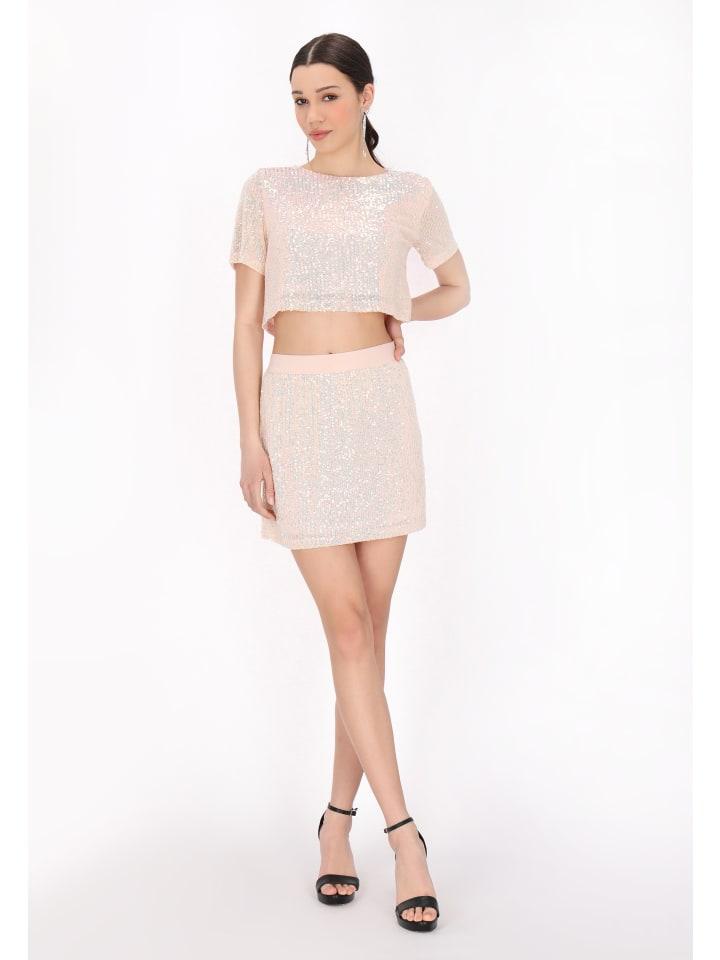 Step out in style with this trendy cropped T-shirt, designed with short sleeves and a classic round neck. Adorned with shimmering sequins, this eye-catching T-shirt adds the perfect touch of glamour to your look. Its regular fit ensures comfort, making it an ideal choice for fancy wear. Part of our exclusive Evening Collection, it's a must-have for every fashion lover!