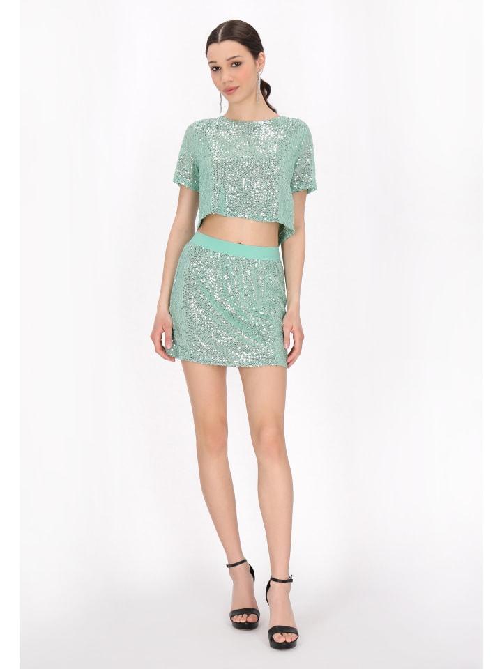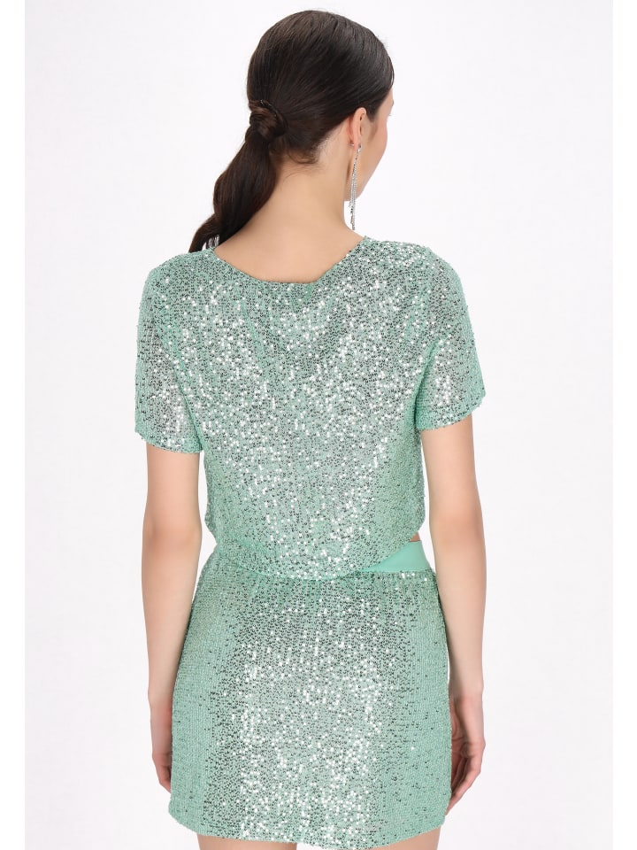 Step out in style with this trendy cropped T-shirt, designed with short sleeves and a classic round neck. Adorned with shimmering sequins, this eye-catching T-shirt adds the perfect touch of glamour to your look. Its regular fit ensures comfort, making it an ideal choice for fancy wear. Part of our exclusive Evening Collection, it's a must-have for every fashion lover!
