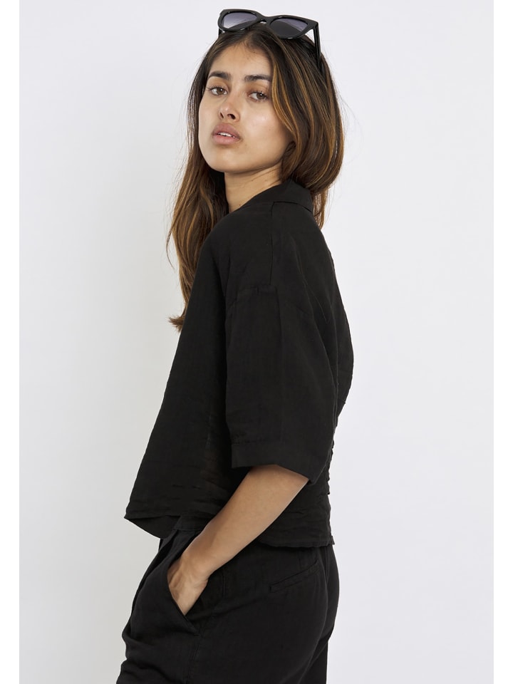 Льняная блузка 'Lena' от Freshlions - элегантный выбор для теплых дней. Выполненный из дышащего льняного материала, он обеспечивает непринужденную посадку, идеально подходящую для летнего повседневного образа. Модель отличается коротким кроем, воротником с отворотом и спереди на пуговицах.