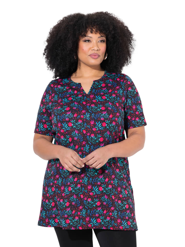Длинная рубашка А-силуэта с рисунком. Вырез туники, полурукав. Удобная ширина подола с карманами.материал