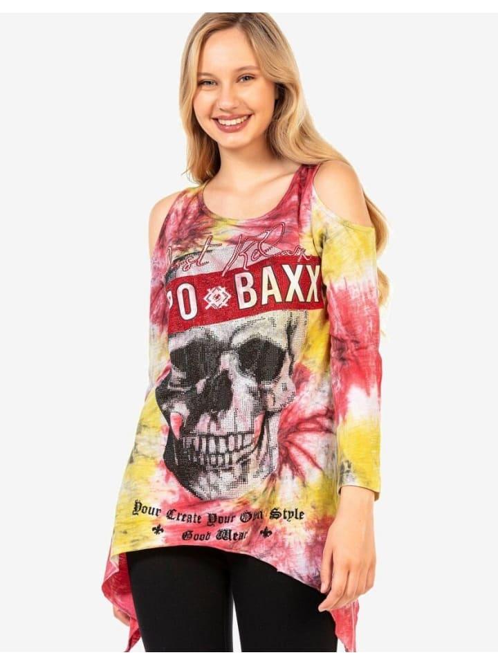 Завязки на подоле и асимметричный крой - вот лишь два основных момента, которые делают рубашку Cipo & Baxx с длинными рукавами модной и обязательной. Красочная модель с градиентным рисунком имеет большой цветной оттиск черепа спереди, который дополнительно украшен маленькими блестящими камушками, что делает его особенно привлекательным. Красиво блестящая на свету рубашка также радует дизайном с открытыми плечами и отличным комфортом.