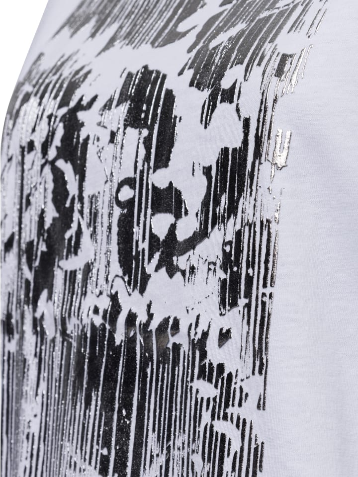 Футболка comma, украшенная уникальным серебристым тактильным принтом спереди, превращается в завораживающее произведение искусства из чистого хлопка, придающее ощущение абстрактного, классного искусства на текстиле.