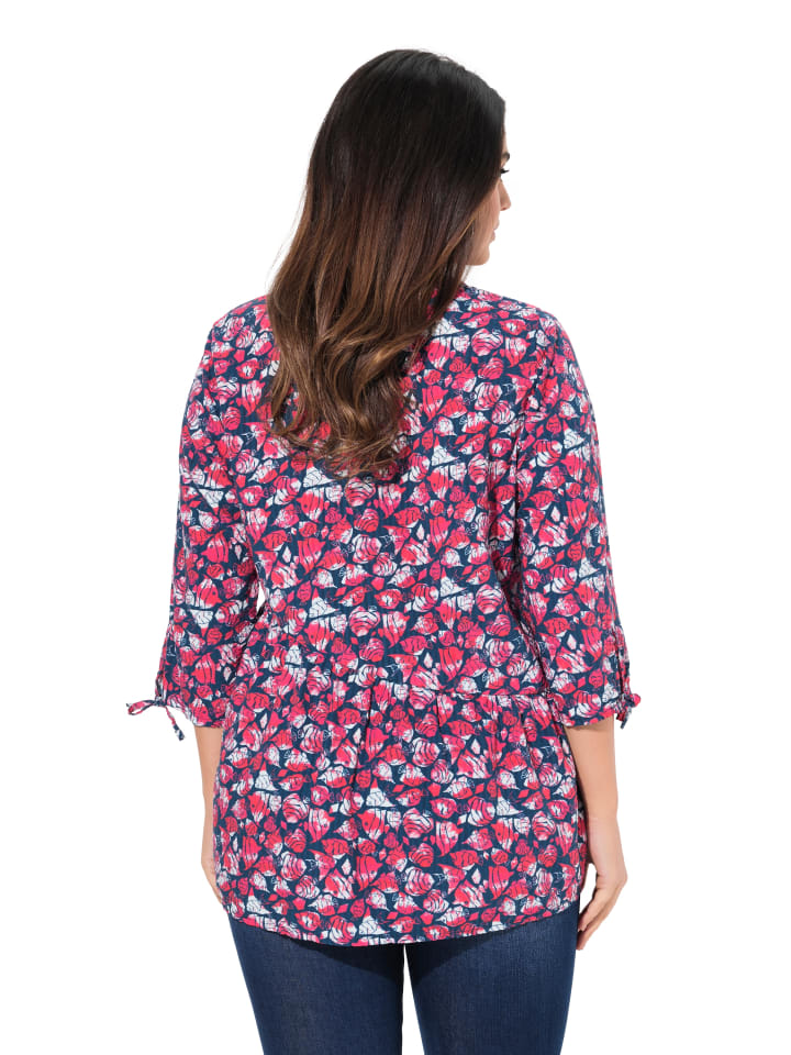 Блузка А-силуэта с рыбным рисунком и воланом по закругленному подолу. Воротник-стойка с V-образным вырезом, рукава 3/4 с разрезом и завязками.материал