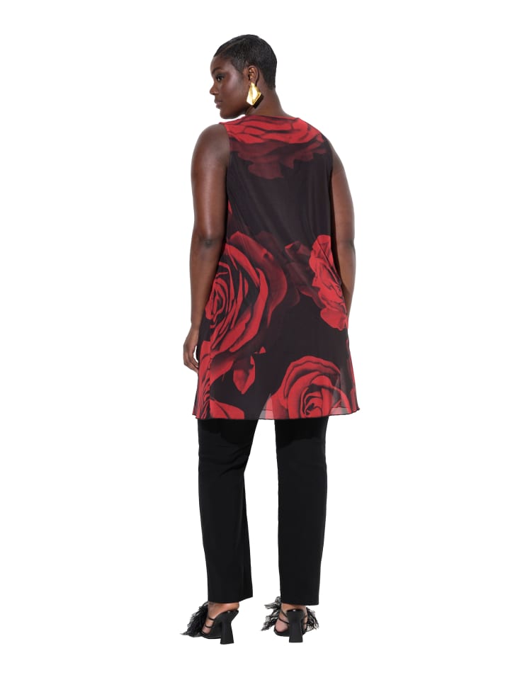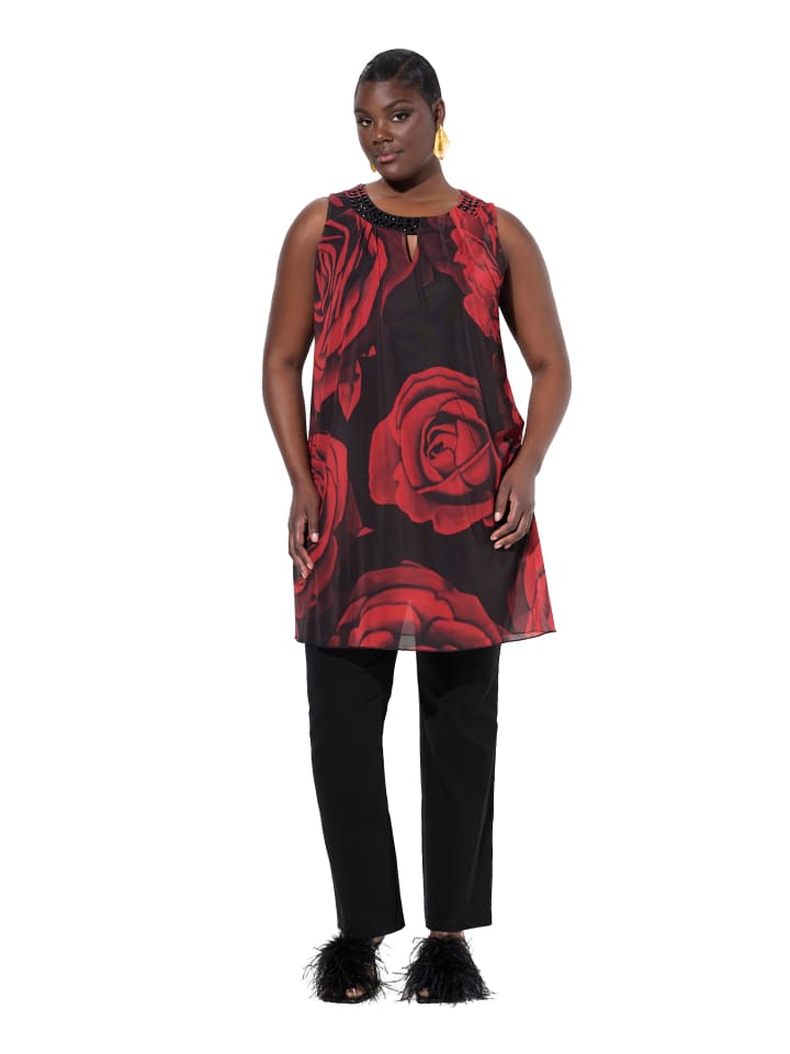 Длинная туника А-силуэта без рукавов из прозрачного шифона с розовым узором. Круглый вырез с блестящими камнями и декоративными складками, спереди с небольшим вырезом. Под ним непрозрачный, более короткий трикотаж.материалы