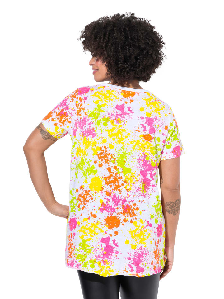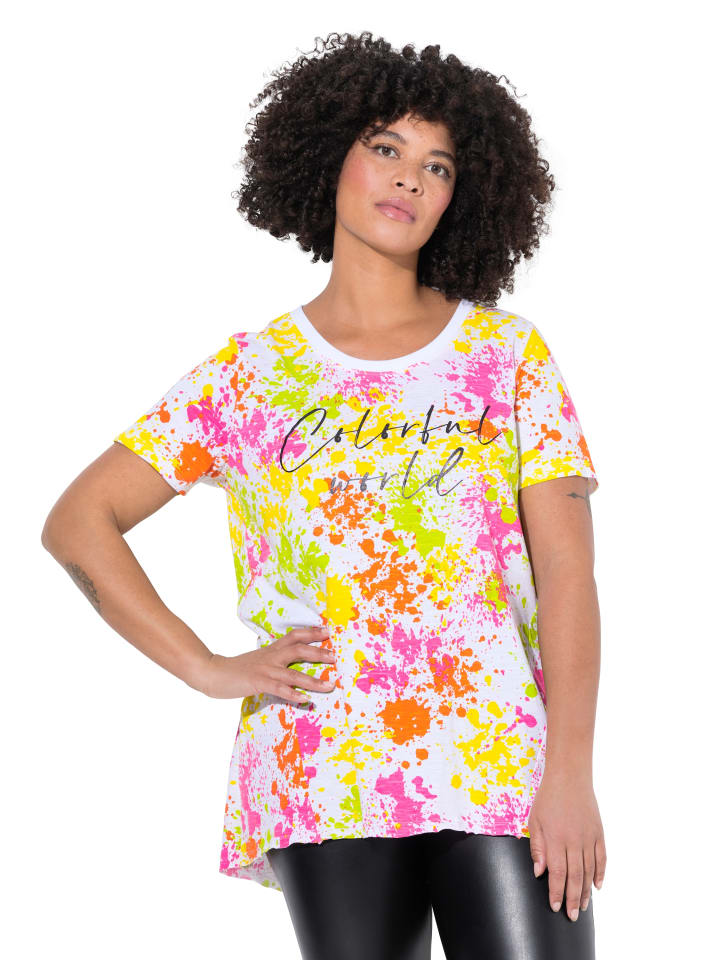 Футболка А-силуэта с цветным принтом и надписью "Colorful World". Круглый вырез, полурукав. Подол с открытыми краями, сзади длиннее.материал