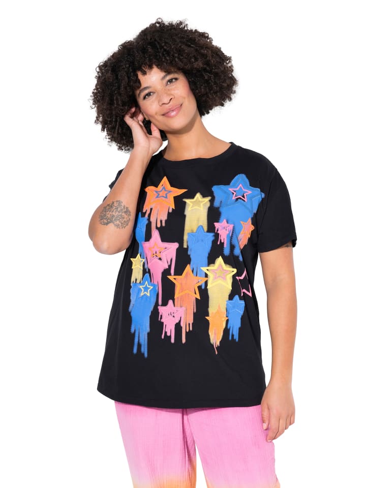 Футболка квадратной формы из мягкого трикотажа со звездным принтом. Круглый вырез, плечи внахлест, полурукавки.материал