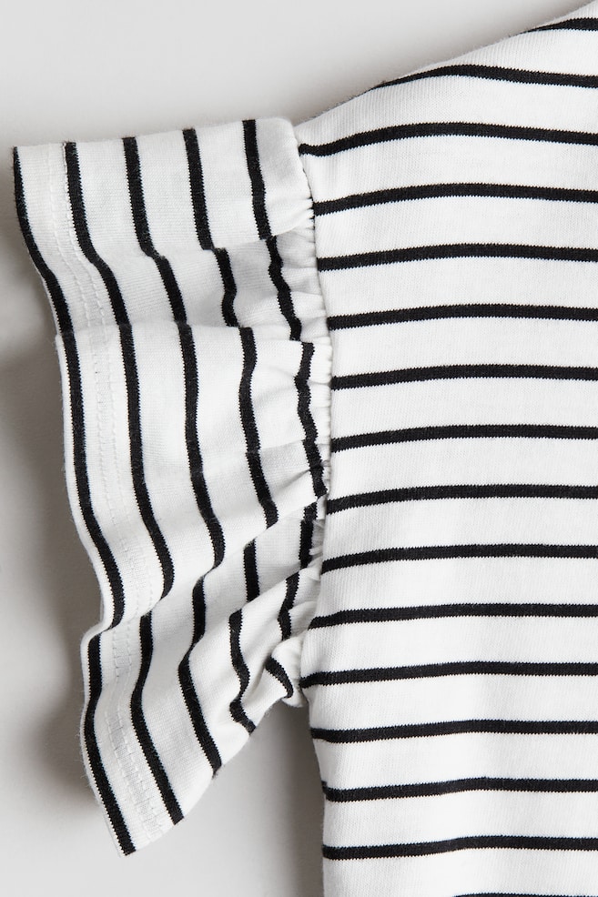 Рубашка из мягкого хлопкового трикотажа с ребристым круглым вырезом, спущенными плечами и воланами на рукавах. Длина: Стандартная длина Длина рукава: Короткий рукав Покрой: Стандартный крой Вырез: Круглый вырез Фасон рукава: Воланы на рукавах Концепция: ОСНОВЫ