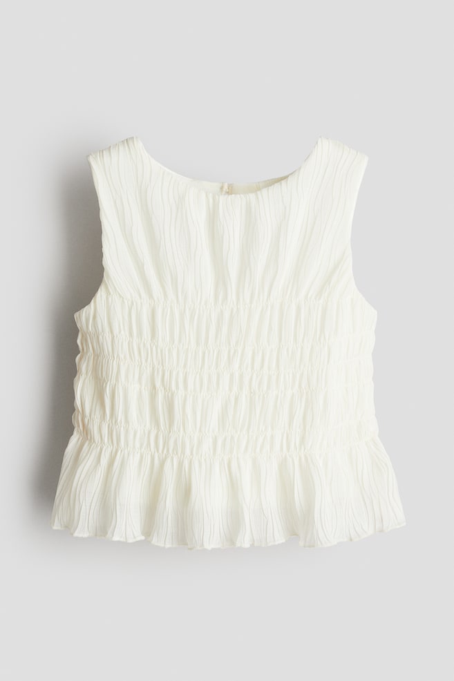 Ограниченная серия H&M. Топ со сборками из прозрачной жатой ткани. Круглый вырез горловины с вырезом-замочной скважиной на шее и баской с оверлочным швом. Подкладка из джерси. Длина: Обычная Длина рукава: Короткий Покрой: Обычная Стиль: Баска, Присборенный Вырез: Круглый