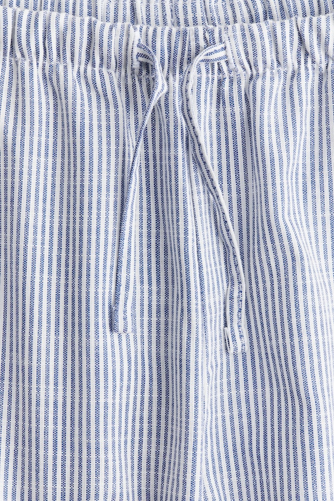 Брюки из ткани с эластичным поясом на шнурке для удобства надевания и снимания, а также скошенными боковыми карманами. Свободный крой.