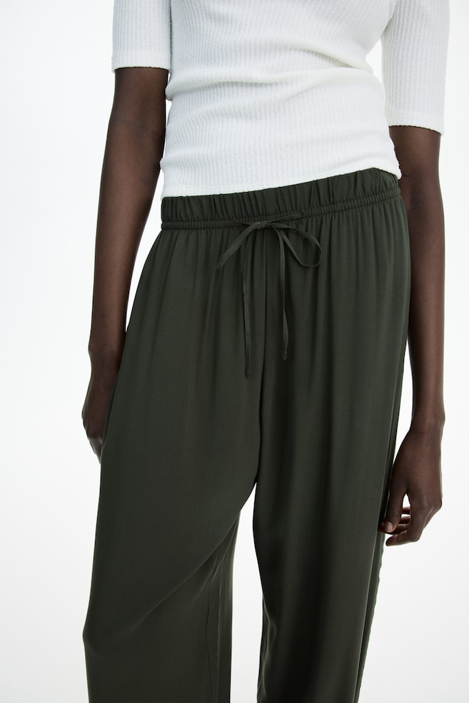 Брюки из воздушной вискозной ткани с высоким эластичным поясом на шнурке, незаметными карманами в боковых швах и широкими прямыми брючинами. Свободный крой. Размер: Длина по внутреннему шву: 76,5 см (размер M) Длина: Длинная Посадка: Высокая талия Посадка: Свободный крой Стиль: Брюки-стринги, прямые