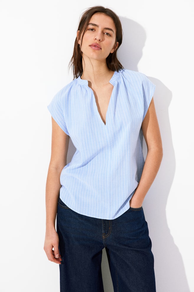 Блузка из воздушной хлопчатобумажной ткани с вискозным воротником-стойкой. V-образный вырез спереди, рукава-крылышки и закругленный подол. Свободный крой. Размер: Длина по спинке: 67,0 см (размер M) Длина: Длинная Длина рукава: Короткий рукав Покрой: Свободный крой Воротник: Воротник-стойка Вырез: V-образный Стиль рукава: Рукав-крылышко